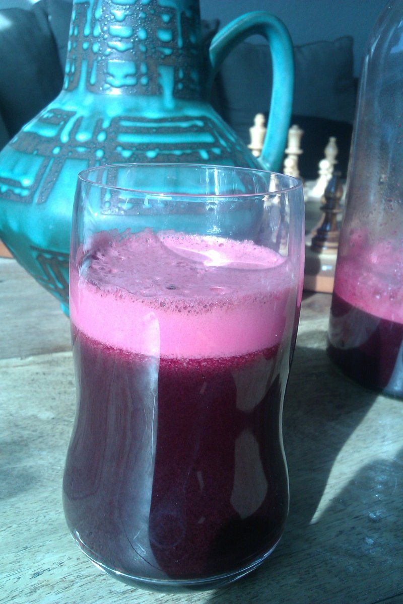 Hæld saften på et stort syltetøjsglas (tomt rødbedeglas) eller flaske med skruelåg/patent-låg (Ikea har nogen til en 10’er) og tag det med dig på farten, drikkes med fordel med sugerør.