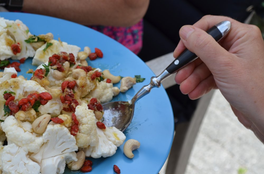 Skær rødkålen (kan også være spidskål eller hvidkål) i moderat fine strimler. Hvis du skærer dem for tyndt og fint så bliver det bare en gang slatten kål lige så snart du hælder dressingen over. Lav dressingen, massér dressingen ind i alt kålen, anret og drys rundhåndet med Goji bær, tranebær og solsikkekerner.